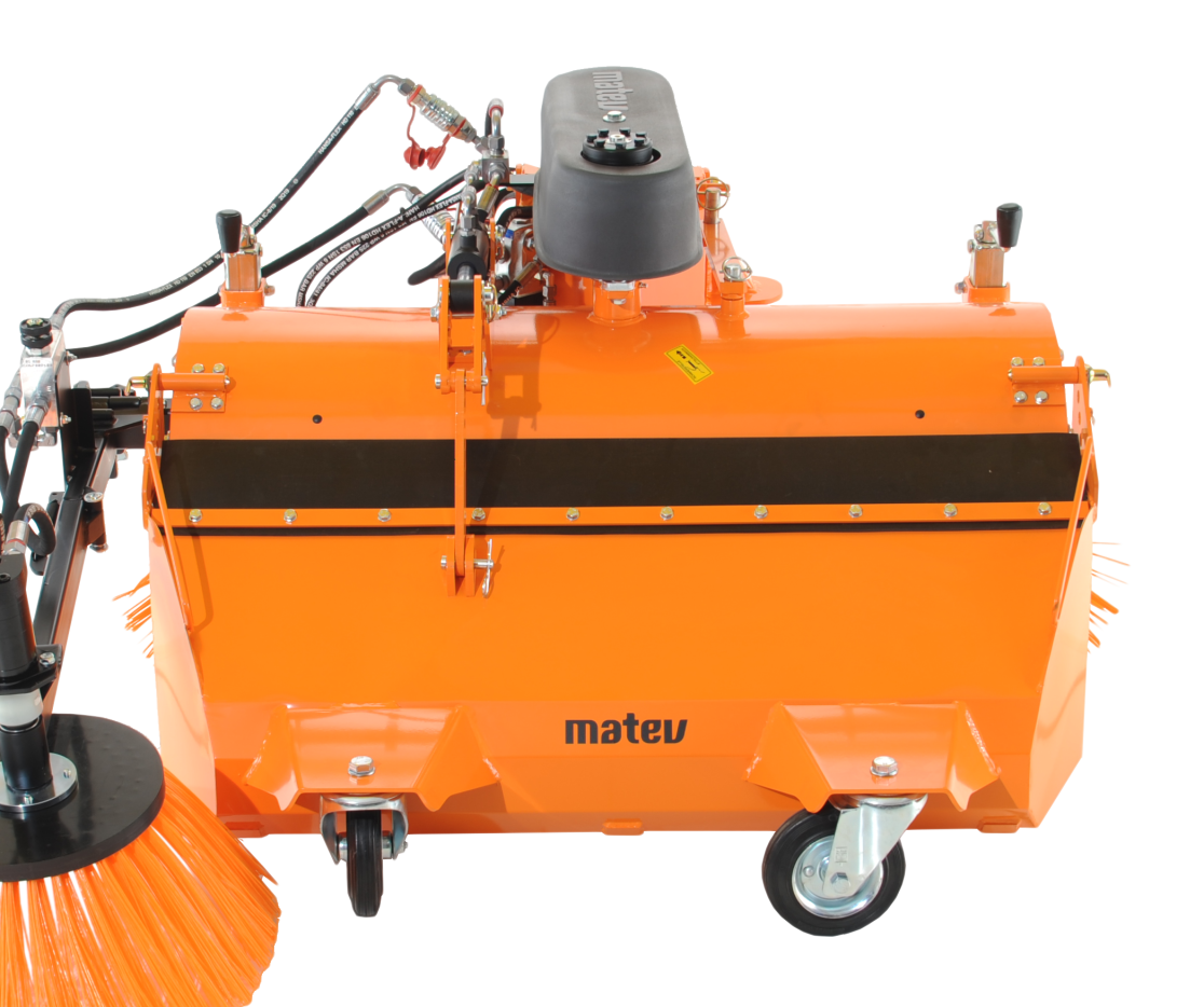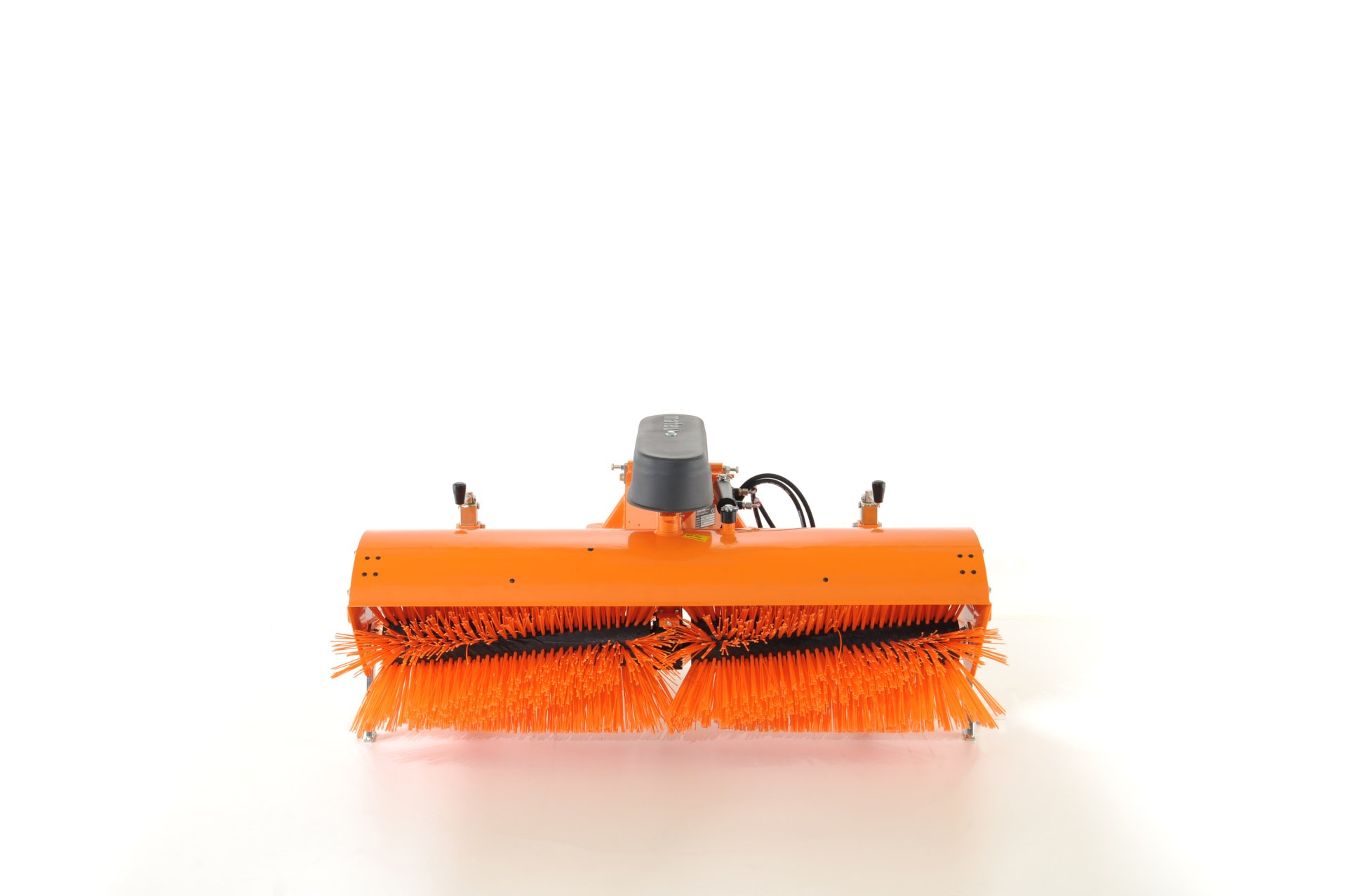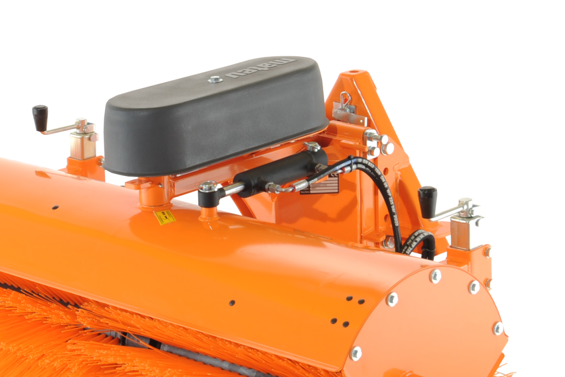 Zusätzlich in der Serienausstattung dieser Frontkehrmaschine enthalten sind eine hydraulische Winkelverstellung zur Seitenverstellung und eine (seitliche) beidseitige Lagerung der Kehrwalzen.