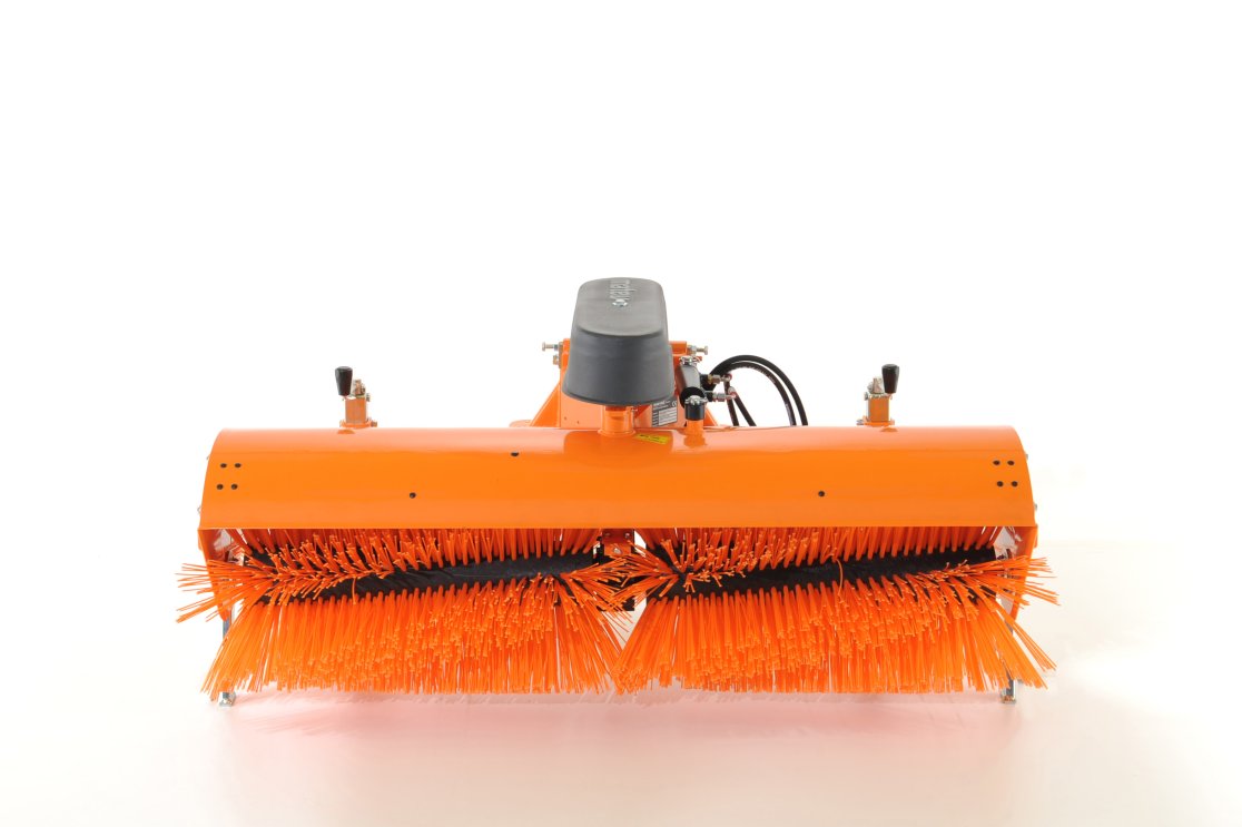 Zusätzlich in der Serienausstattung dieser Frontkehrmaschine enthalten sind eine hydraulische Winkelverstellung zur Seitenverstellung und eine (seitliche) beidseitige Lagerung der Kehrwalzen.