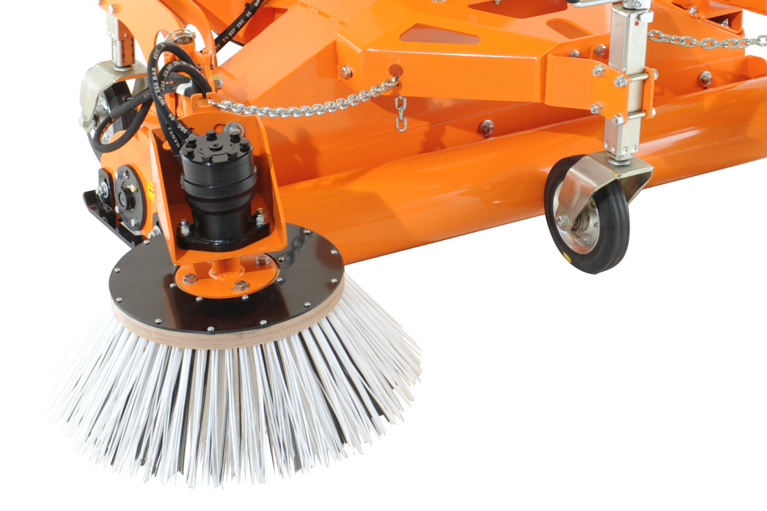 Durch die für beide Seiten optional erhältlichen Seitenbesen mit wahlweise Stahlbesatz oder Misch-Besatz aus Stahl/Perlon kann die Arbeitsbreite auf bis zu 2,10m erweitert werden und auch in Randbereichen präzise gereinigt werden.