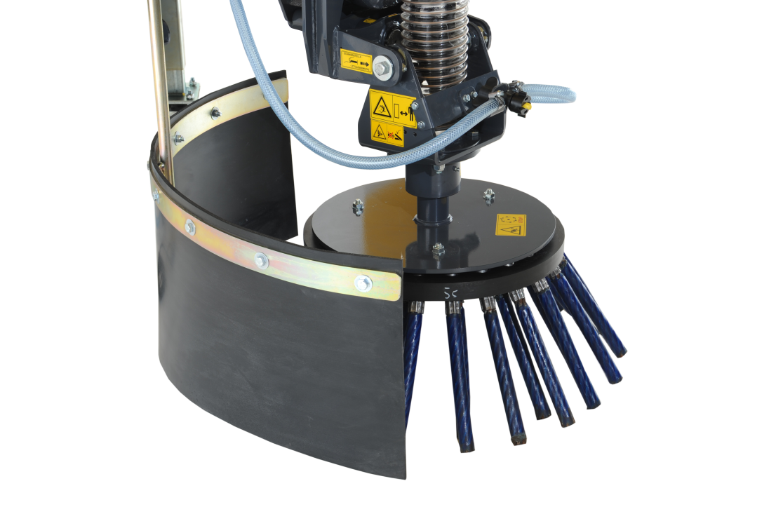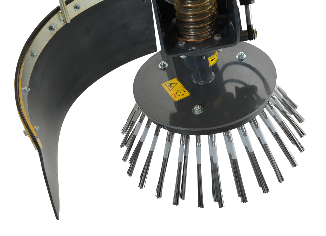 Der optional erhältliche und auf die jeweilige Bürsteneinstellung anpassbare Spritzschutz verhindert effektiv das Wegschleudern von Schmutz und Steinen durch die Bürste.