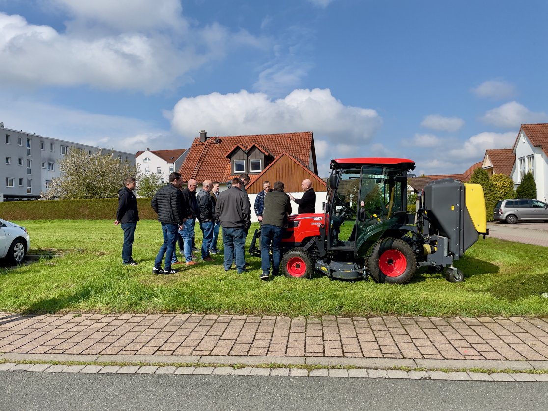 Die Entwicklung des neuen Zwischenachsmähwerks MOW-MM 152 mit passender Aushebung für den KIOTI CS 2510 sowie der Konstruktion von robusten Frontkrafthebern und weiterer Grundausstattung, wie Motorzapfwellen, Hydraulikerweiterungssätzen oder Vorderradkotflügeln, für die Traktormodelle CS 2520, CX 2510 und CK 4030 führten dazu, dass der südkoreanische Traktorhersteller KIOTI seine Zusammenarbeit mit der matev GmbH im letzten Jahr deutlich ausgebaut. Im April wurde die Zusammenarbeit durch eine gemeinsame Schulung mit Daedong Kioti Europe B.V. für die KIOTI Händler aus ganz Deutschland weiter vertieft. Die bei der matev stattfindende Schulung mit Praxis-und Theorieteil ging zunächst auf die von matev entwickelten traktorspezifischen Produkte für KIOTI ein und ging dann über zum gesamten Produktportfolio wie weiteren Anbaugeräten für die Grünpflege, dem Winterdienst und der Grauflächenpflege. Highlight der Schulung war das gemeinsame Testmähen mit dem neuen MOW-MM 152 Multifunktionsmähwerk am Kioti CX 2510, bei dem die Händler das neue Mähwerk im Einsatz erleben konnten.