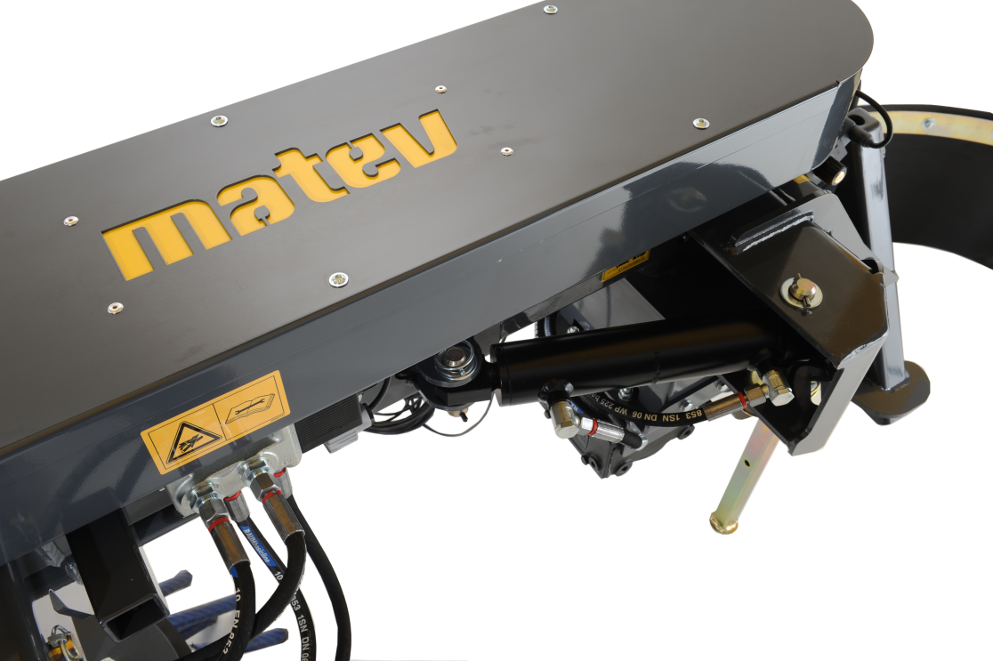 The weed brush's hydraulic swivel boom arm has a 70° swivel range. There is a convertible hydraulic cylinder that allows the arm to pivot and work to the left in the direction of travel, if needed.