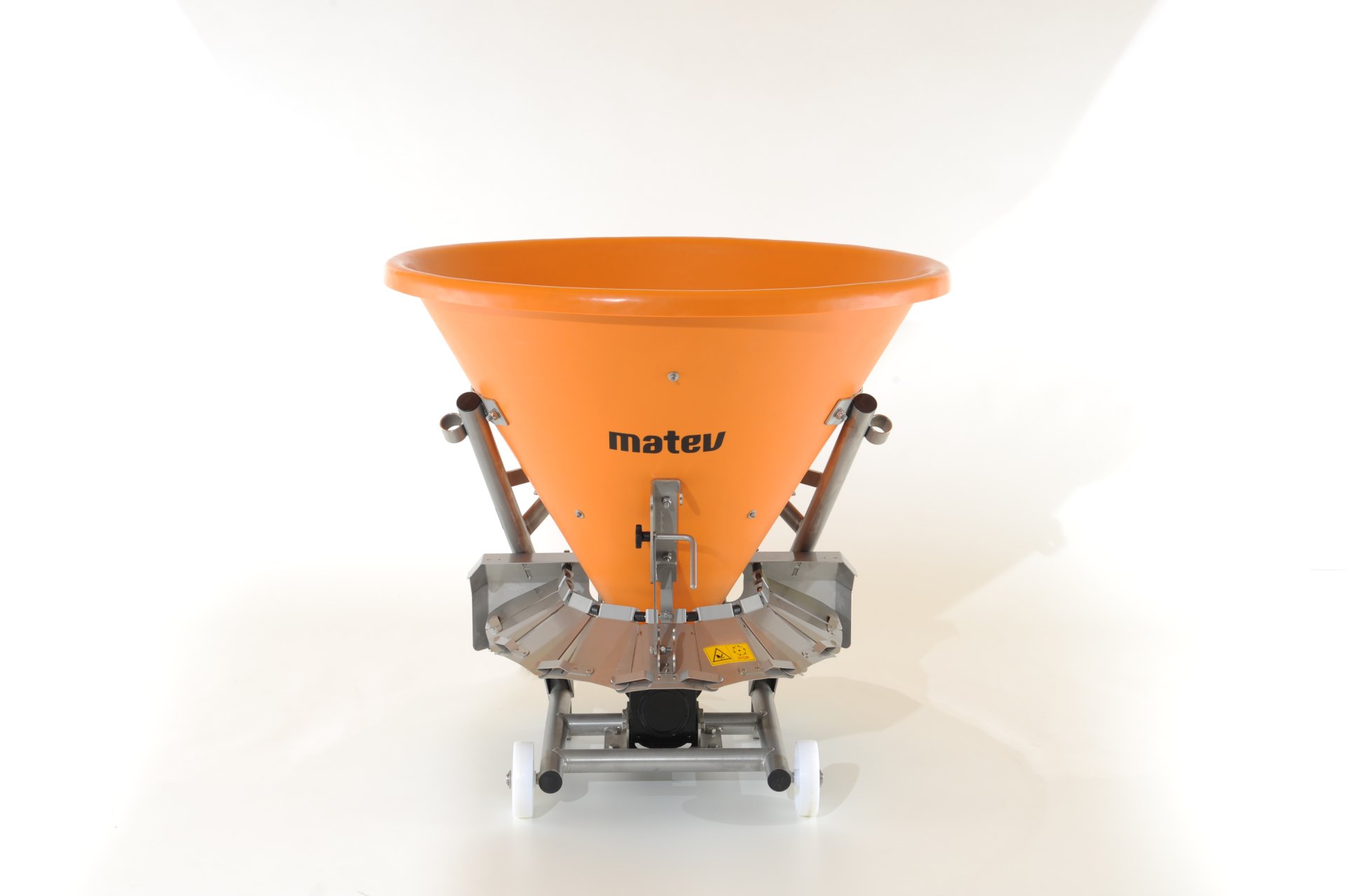 The mechanical, optionally hydraulic or electronic as well as path-dependent regulation of spread rate and width enables precise and exactly metered spreading as required, both with a small spread width, for example on sidewalks, and over large areas with a spread width of up to 8 meters.